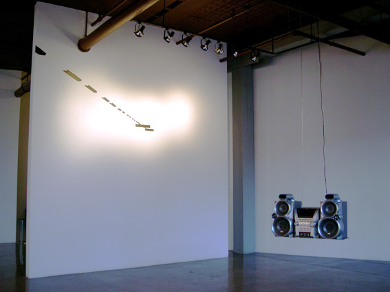 Feedback Babies Version 1 2007 Sonic sculpture, sound, loop. 2 JVC stereo systems, cd, plywood, steel cables, electricity cables and paint. Soundtrack composed by the artist
